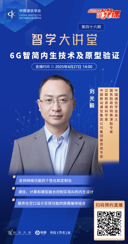 4月27日14:00,智学大讲堂第46期将邀请中国移动研究院集团级首席专家刘光毅做题为“6G智简内生技术及原型验证”的报告,欢迎大家收看(长按图片识别)。
