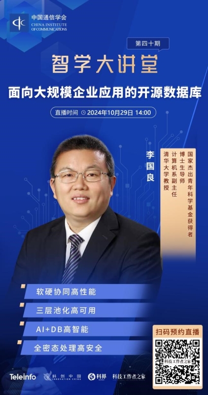 10月29日,智学大讲堂第40期邀请清华大学计算机系副主任李国良教授做题为“面向大规模企业应用的开源数据库”的报告。
