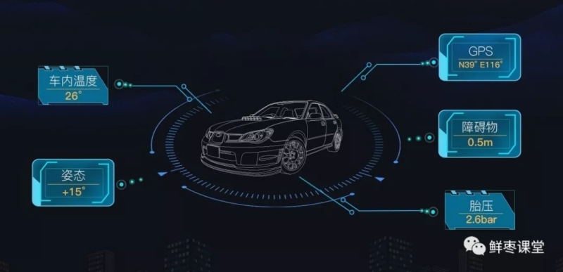 对于一辆车来说,它包括很多的部件,例如空调、音响、摄像头、发动机、轮胎等。这些部件都可以信息化、数字化。通过安装传感器,可以产生表达状态的数据。例如轮胎,可以安装胎压传感器,产生胎压数据,监控轮胎的状态。