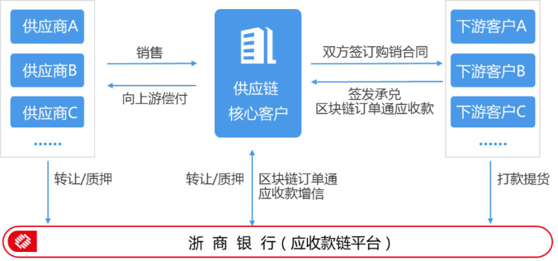 为了解决企业的痛点问题,浙商银行推出了基于区块链技术的应收款链平台,平台将企业供应链中沉淀的应收账款改造成数字凭证——区块链应收款,客户可在平台办理应收账款签发、承兑、保兑、偿付、转让、质押、兑付等业务。区块链应收款可在供应链内流转,减少整个供应链的外部资金需求。
