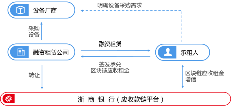 设备厂商的下游客户可通过租赁公司获得设备直租或回租服务,再通过应收款链平台签发、承兑区块链应收款偿付租金,解决设备投入压力大的问题;租赁公司可将区块链应收租金全部或部分转让银行,提前收回租金。