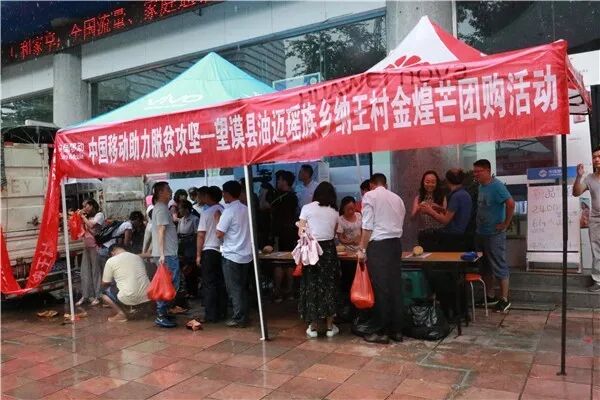 将芒果全部送到村支书家以后,众人开始给自家的芒果上秤,记下每一家采摘的芒果重量。将采摘的芒果装车以后,由油迈乡人大主席、纳王村村支书做村民代表与望谟县公司经理和驻村干部等人一同跟车前往黔西南分公司所在地。当芒果送到时,黔西南分公司的工作人员早已在营业厅门口设好摊位,拉好横幅。由于有前期的宣传造势的铺垫,现场早已有人等候购买了。当金灿灿的“金煌芒”终于带着村民们脱贫致富的梦想赶到公司门口时,现场已是人头攒动,气氛火热。