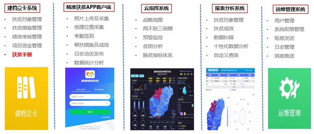 2018年5月已建成海南省精准扶贫大数据管理平台,平台由建档立卡系统、海南扶贫APP、云指挥平台,报表分析、运维管理五大模块组成,在保留国家系统基本功能基础上,结合海南扶贫实际工作需求,新增数据共享交换、数据比对及预警推送、扶贫手册等个性化功能。