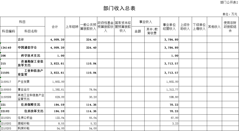 按照综合预算的原则,中国通信学会所有收入和支出均纳入部门预算管理。收入包括:一般公共预算拨款收入和事业单位经营收入;支出包括:科学技术支出、资源勘探工业信息等支出和住房保障支出。中国通信学会2022年收支总预算4,009.20万元。