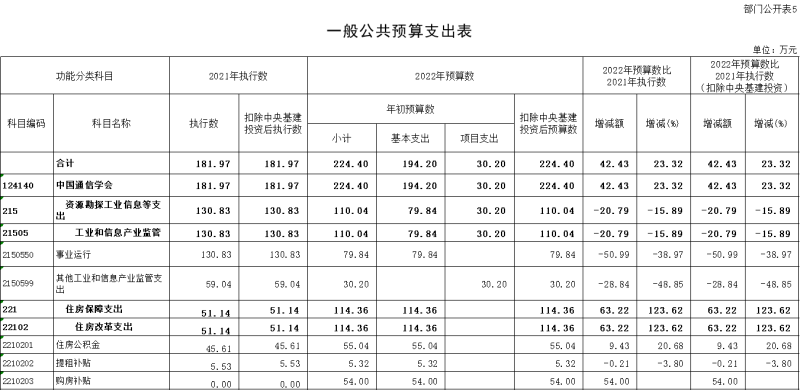 中国通信学会2022年财政拨款收支总预算224.40万元。收入包括:一般公共预算拨款224.40万元;支出包括:资源勘探工业信息等支出110.04万元、住房保障支出114.36万元。