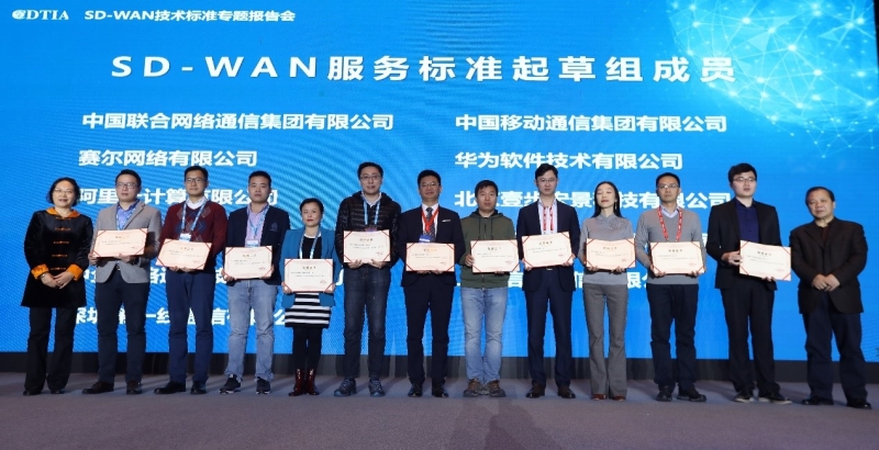SD-WAN服务标准起草组首批共确定了11家起草单位,分别是中国联合网络通信集团有限公司、中国移动通信集团有限公司、赛尔网络有限公司、华为软件技术有限公司、阿里云计算有限公司、北京壹步宏景科技有限公司、上海易声通信技术发展有限公司、深圳市赛柏特通信技术有限公司、中企网络通信技术有限公司、上海信天通信有限公司、深圳第一线通信有限公司。工业和信息化部通信科技委常委、中国通信学会战略与政策专委会委员周建明先生、中国跨境数据通信产业联盟副理事长刘占霞女士为11家SD-WAN服务标准起草单位颁发聘书。