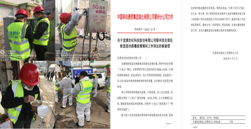 1.身处疫情中心区域的宜通世纪湖北分公司,第一时间成立了应急领导小组,统一指挥,做好通信保障工作,并严格执行安全生产日报制度,做好防范,保障安全。由于防疫物资缺乏,很多一线员工只能用乙醇消毒,特殊时期吃泡面充饥,但疫区的宜通人一直坚守工作岗位,已多日未曾回家。1月26日,鄂州项目部接到鄂州“小汤山”医院的新建基站建设施工任务后,项目经理邓威带领余志全、程云勇、胡小勇等面对疫情,克服时间紧迫、人手紧张、调运不畅等种种困难,不顾个人安危,在医院易感染地穿梭,以泡面果腹,以工地为家,一直战斗在最前线,在短短几天的时间里,圆满完成鄂州“小汤山”医院5G网络通信建设任务,展现了一个通信人的责任与担当。