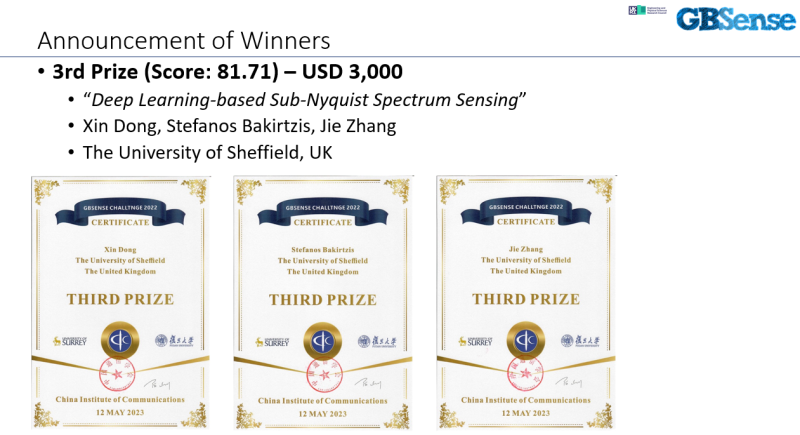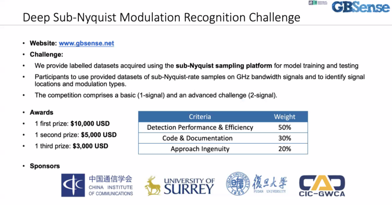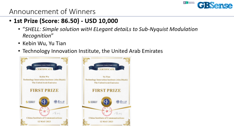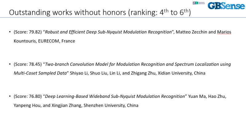 挑战赛开始于2022年6月20日,共吸引了来自全球26个国家108个机构的174支团队注册,其中156名成员来自大学及研究机构,18名成员来自企业机构。12支团队进入了预赛,经过激烈的角逐,评选出了前三名。第一名是来自阿拉伯联合酋长国技术创新研究所Kebin Wu, Yu Tian的作品“SHELL: Simple solution witH ELegant detaiLs to Sub-Nyquist Modulation Recognition”,第二名是来自深圳大学Saifullahi Aminu Bello, Jiawei Mao, Jian Lu, Chen Xu, Lin Li的作品“Attention-Based Deep Residual Network for Multiple Signal Modulation and Sub-band Recognition”,第三名是来自英国谢菲尔德大学Xin Dong, Stefanos Bakirtzis, Jie Zhang的作品“Deep Learning-based Sub-Nyquist Spectrum Sensing”。