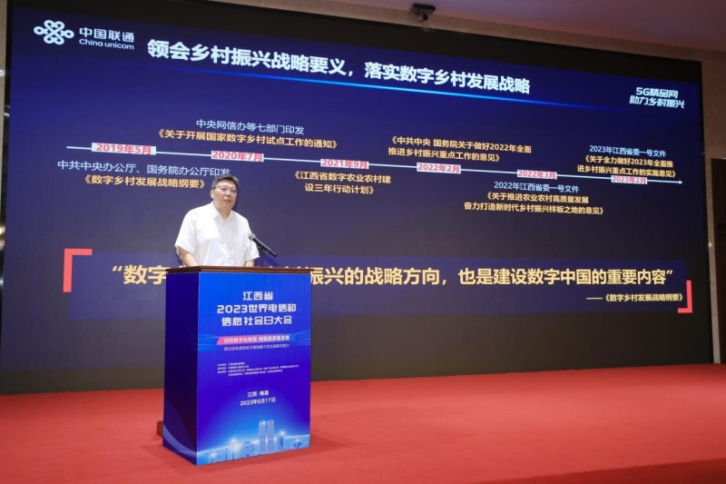 江西联通副总经理张伟在“江西省2023世界电信和信息社会日大会”上发布“5G精品网 助力乡村振兴”