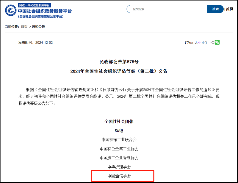 12月2日,民政部发布《2024年全国性社会组织评估等级(第二批)公告》(民政部公告第575号),中国通信学会获评社会组织评估的最高等级5A级全国性社会团体。