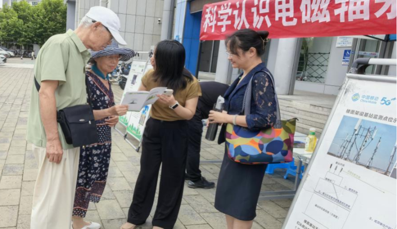 工作人员正在给居民介绍我国电磁辐射相关标准