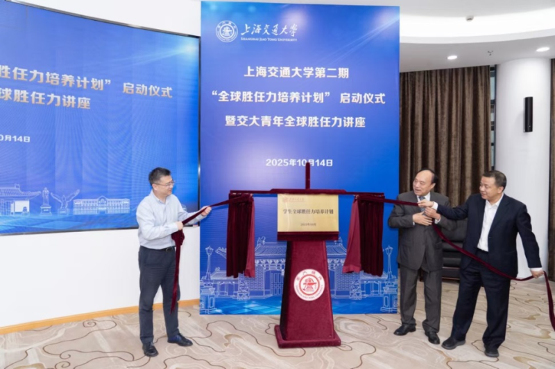 赵厚麟名誉理事长、文剑副秘书长和校领导共同为上海交通大学第二期“学生全球胜任力培养计划”揭牌。