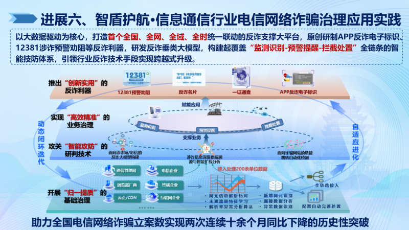 中国信通院防范治理电信网络诈骗团队以大数据驱动为核心,打造首个全国、全网、全域、全时统一联动的反诈支撑大平台,原创研制APP反诈电子标识、12381涉诈预警劝阻等反诈利器,研发反诈垂类大模型,构建起覆盖“监测识别-预警提醒-拦截处置”全链条的智能技防体系,引领行业反诈技术手段实现跨越式升级。