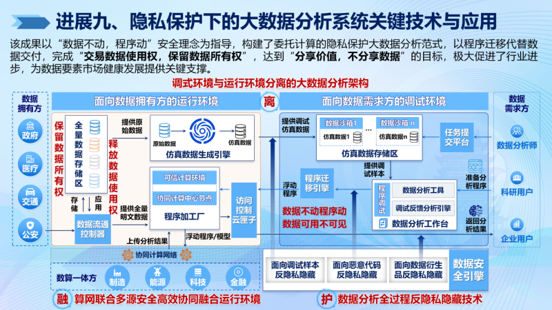 该成果以“数据不动,程序动”安全理念为指导,构建了委托计算的隐私保护大数据分析范式,以程序迁移代替数据交付,完成“交易数据使用权,保留数据所有权”,达到“分享价值,不分享数据”的目标,极大促进了行业进步,为数据要素市场健康发展提供关键支撑。