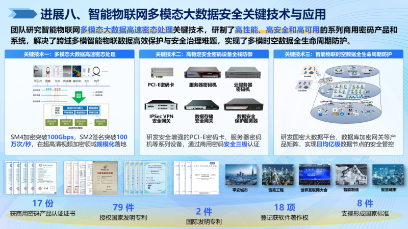 团队研究智能物联网多模态大数据的高速密态处理关键技术,研制了高性能、高安全和高可用的系列商用密码产品和系统,解决了跨域多模智能物联数据高效保护与安全治理难题,实现了多模时空数据全生命周期防护,填补了智能物联网多模大数据安全领域的国内外空白。