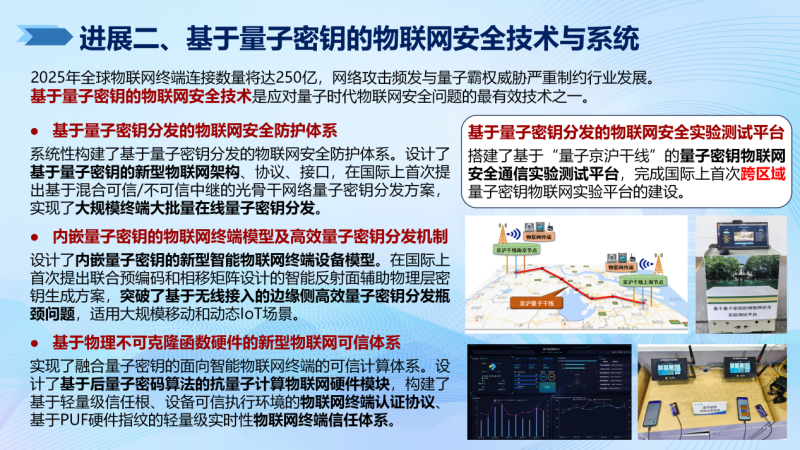 东南大学陈立全研究团队深入研究了基于量子密钥的物联网安全技术,提出并实现了量子密钥基于在线方式到达无线物联网的技术方法,成功突破了边缘侧量子密钥分发瓶颈问题,实现了跨区域的量子密钥物联网安全通信系统,为物联网系统性构建了量子安全级别防护体系。