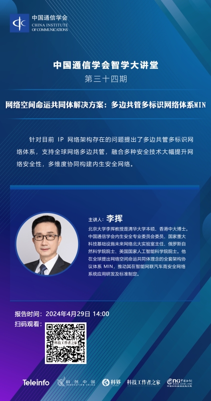 4月29日,智学大讲堂第34期邀请北京大学教授李挥做题为“网络空间命运共同体解决方案:多边共管多标识网络体系MIN”的报告。