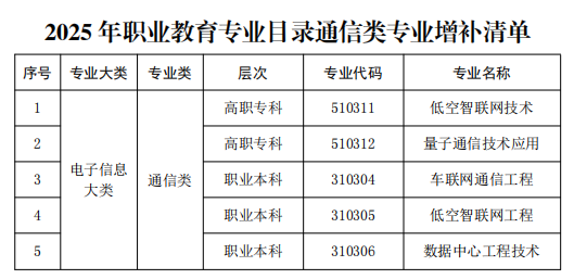 根据《教育部办公厅关于做好2026年职业教育拟招生专业设置管理工作的通知》,57个中职、高职专科和职业本科新设专业进入《2025年职业教育专业目录增补清单》,其中由中国通信学会、全国工信行指委通信分委员会申报的低空智联网技术(高职专科)、量子通信技术应用(高职专科)、车联网通信工程(职业本科)、低空智联网工程(职业本科)、数据中心工程技术(职业本科)等5个职业教育通信类专业正式获批。
