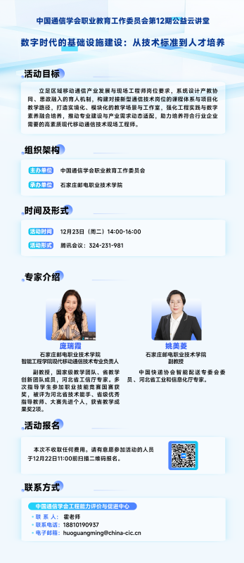 12月23日活动预告丨中国通信学会职业教育工作委员会第12期公益云讲堂 数字时代的基础设施建设从技术标准到人才培养