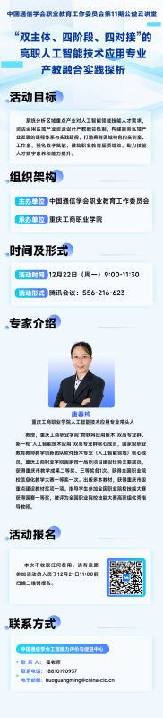 12月22日活动预告丨中国通信学会职业教育工作委员会第11期公益云讲堂“双主体、四阶段、四对接”的高职人工智能技术应用专业产教融合实践探析